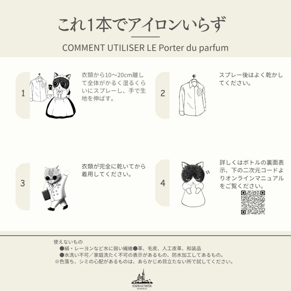 衣類用シワ伸ばしスプレー、シワ取りスプレー Porter du parfum (ポフティ ドゥ パルファム)【Fleur de Jasmin】