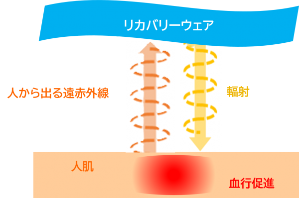リカバリーウェアの効果の仕組みは、人体から出る遠赤外線をリカバリーウェアの特殊素材によって人体に輻射させる事で人体の血行促進を図り疲労を回復させます。血行が促進すると皮膚の表面温度を上げ、身体の深部体温を上げます。就寝時に着用すると、心地よく入眠し熟睡へと導きかれ疲労回復に繋げます。