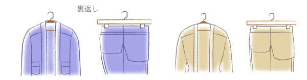 《3》ウォッシャブルスーツを裏返してハンガーに掛けます。